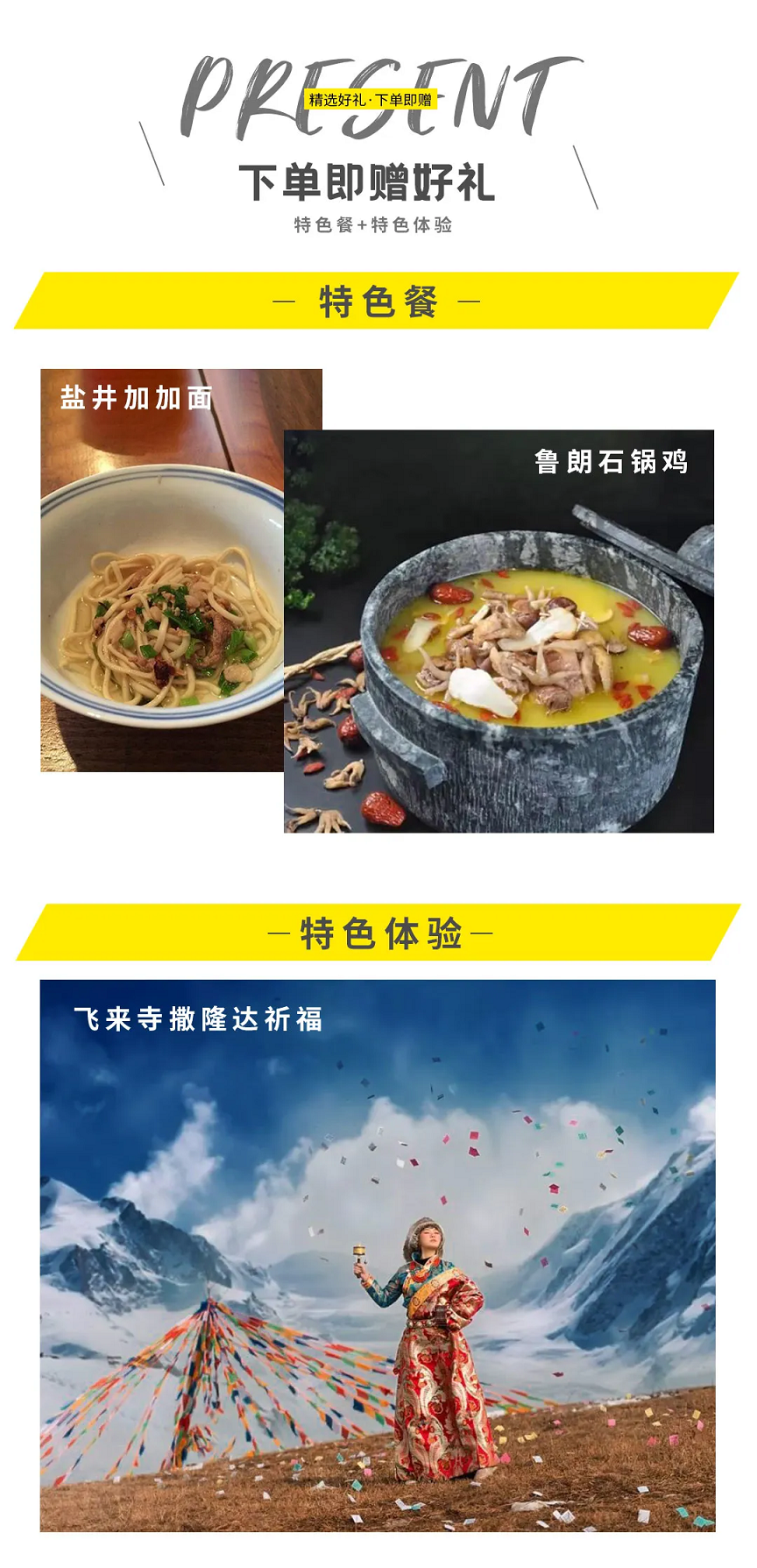 5、贈送:贈送鹽井加加面、魯朗石鍋雞、飛來寺撒龍達祈福、2人同時報名贈送接機服務一次、一次性雨衣一件;贈送藏服拍照;拉薩住宿一晚;贈送項目不用不退