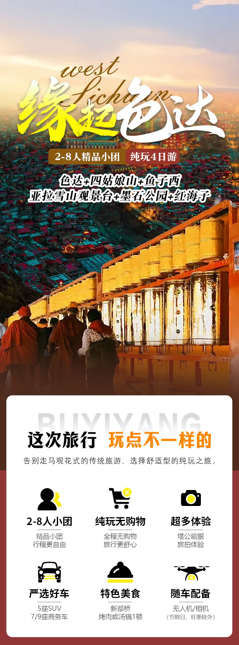 2、如魚(yú)子西無(wú)法前往,替換為八郎生都村、扎真、新都橋觀景臺(tái)等同類型觀景點(diǎn),如產(chǎn)生相關(guān)景點(diǎn)中轉(zhuǎn)車、清潔費(fèi)等費(fèi)用,需自理。