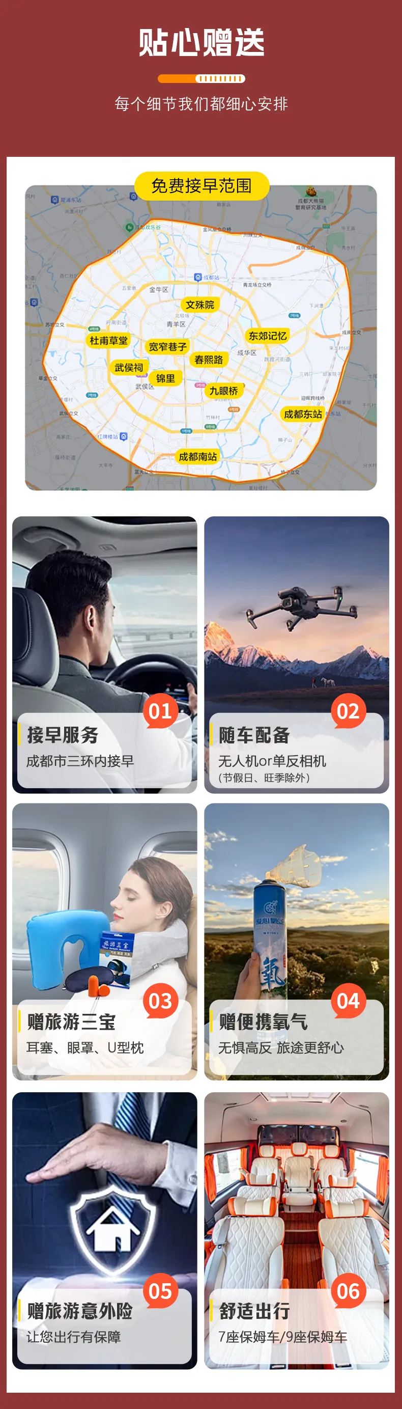 6、關(guān)于出團(tuán):出發(fā)前一天21:00點(diǎn)前師傅會(huì)通知出發(fā)當(dāng)天的集合時(shí)間、地點(diǎn),以司兼導(dǎo)通知為準(zhǔn),成都市區(qū)三環(huán)內(nèi)包上門接,或報(bào)銷打車費(fèi)到統(tǒng)一地方集合。如21:00點(diǎn)前還未接到通知,請(qǐng)聯(lián)系你的客服。