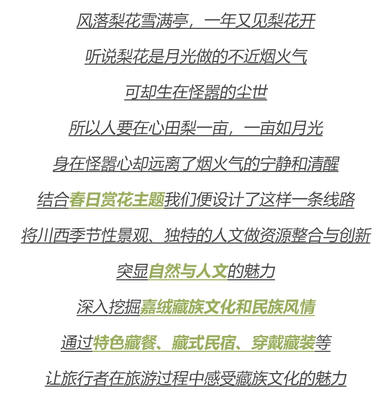 梨花處處有,而唯獨金川梨花是你春天不能錯過的地方,早起欣賞炊煙晨霧中的中路藏寨后,乘車沿著金川河谷出發(fā),連綿數十公里的道路兩旁全部都是雪白的梨花,前往【沙耳鄉(xiāng)】拍攝滿村的潔白梨花,下午前往【喀爾鄉(xiāng)觀景臺】拍攝金川梨花全景!拍攝完畢后回到【甲居藏寨】入住,享用藏家特色晚餐。單團10人及以上安排藏家篝火表演,與嘉絨姑娘小伙一起載歌載舞。