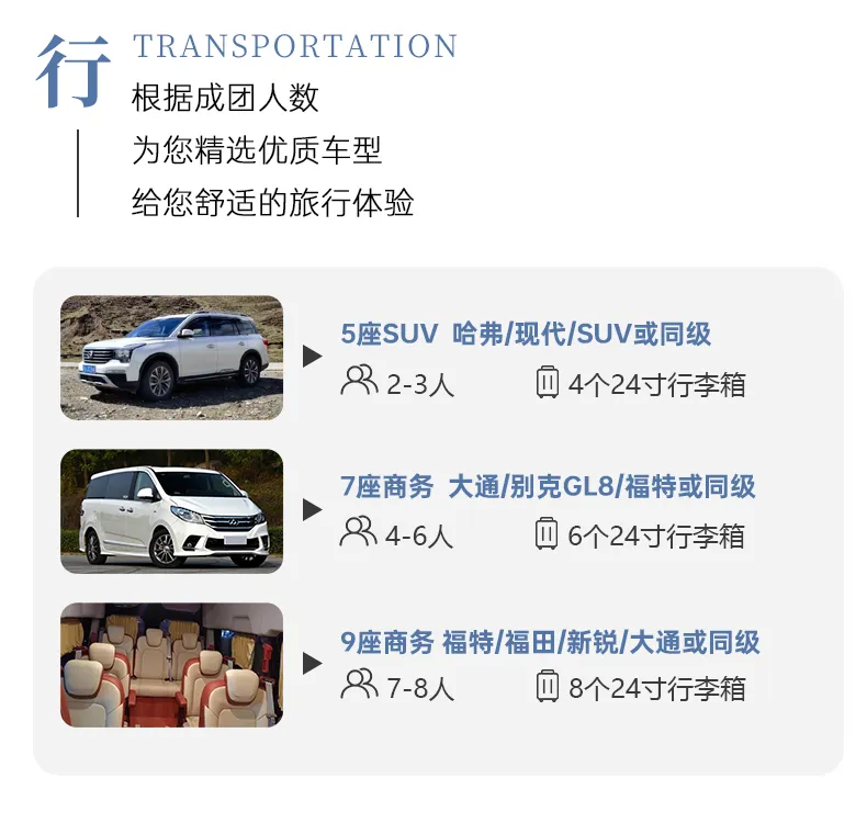 1、交通:全程包車往返,根據(jù)人數(shù)選擇合適車型(已含司機(jī)兼向?qū)С宰⊙a(bǔ)貼,司機(jī)熟悉路線并給隊(duì)員游玩建議,但不會(huì)像專業(yè)導(dǎo)游一樣解說也不會(huì)進(jìn)景區(qū),請(qǐng)理解);