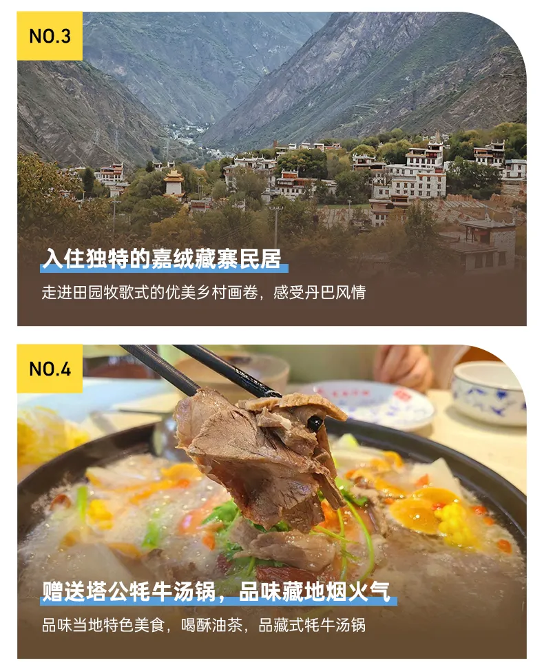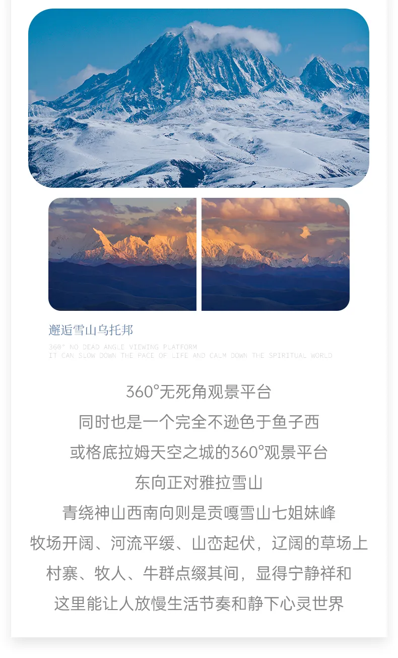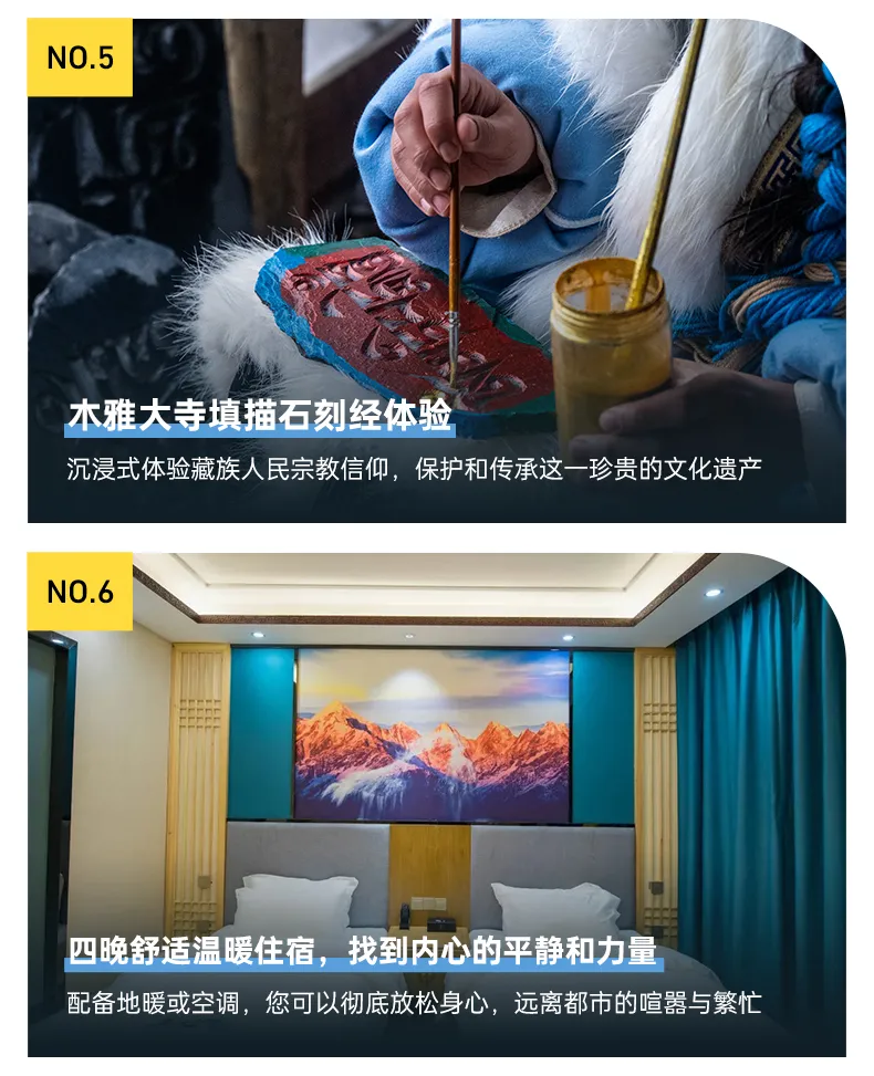 ?早餐后從塔公出發(fā),游玩塔公草原和木雅大寺,我們將從刻經(jīng)房,請(qǐng)出還未上色的石刻經(jīng)版。用代表天空、大地、雪山、草原、太陽與菩提心的六種色彩,填描六字真言梵語字母,一邊填描上色,一邊心里默誦真言,然后放進(jìn)規(guī)模宏大的瑪尼石城,接受所有轉(zhuǎn)經(jīng)人的祈禱。這是對(duì)自己的祝禱,也是對(duì)所有親人朋友的祝禱!之后我們選擇走海拔最高的機(jī)場(chǎng)公路—康定機(jī)場(chǎng)旁邊的S434省道,這是一個(gè)極易出片的網(wǎng)紅點(diǎn),一路是牛羊點(diǎn)點(diǎn)的江巴草原,可遙望貢嘎雪山、回頭可見雅拉雪山。沿途游玩紅海子,下午抵達(dá)牛背山景區(qū),這里換乘中轉(zhuǎn)車后直達(dá)山頂,整理好行李之后,大家可以前往3666觀景臺(tái),360°無死角的觀景平臺(tái)之中,每一眼都是云海之上的奇跡,彼岸的貢嘎群山宣示著蜀山亙古的壯美。