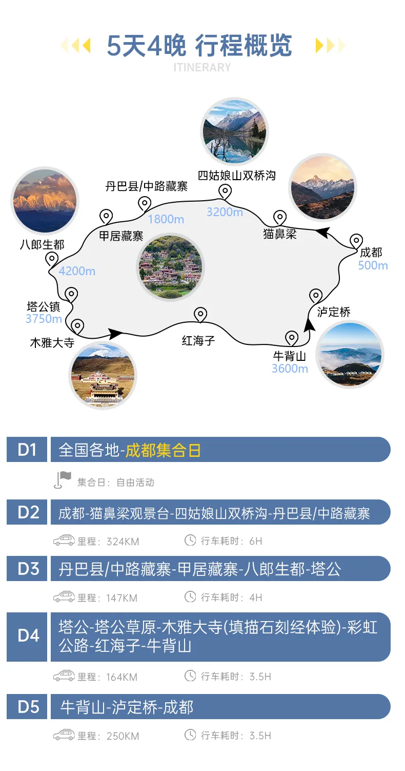 成都---貓鼻梁觀景臺(tái)---四姑娘山雙橋溝---丹巴縣或中路藏寨(約324km 車程約6小時(shí))