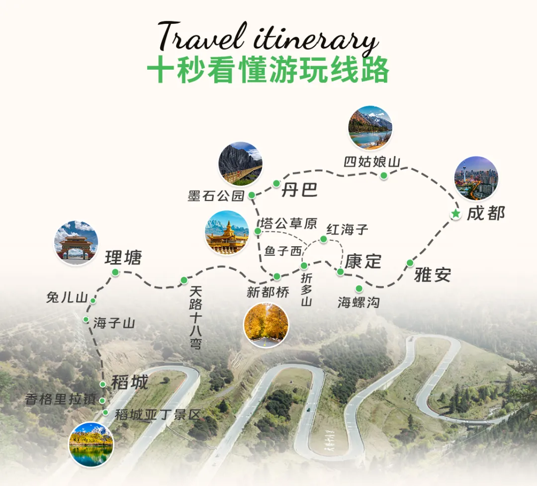 沿途景點(diǎn):天路十八彎、理塘(丁真的家鄉(xiāng))、兔兒山、海子山