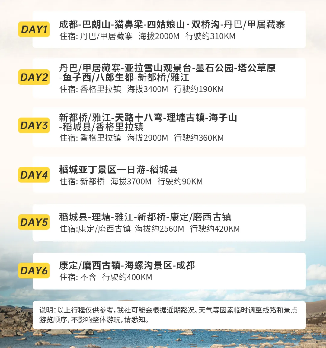 特別說明:此行程根據(jù)實(shí)際情況,可能從新都橋進(jìn),四姑娘山出,行程游覽景點(diǎn)不變,只是游覽順序不同,請(qǐng)知悉!
