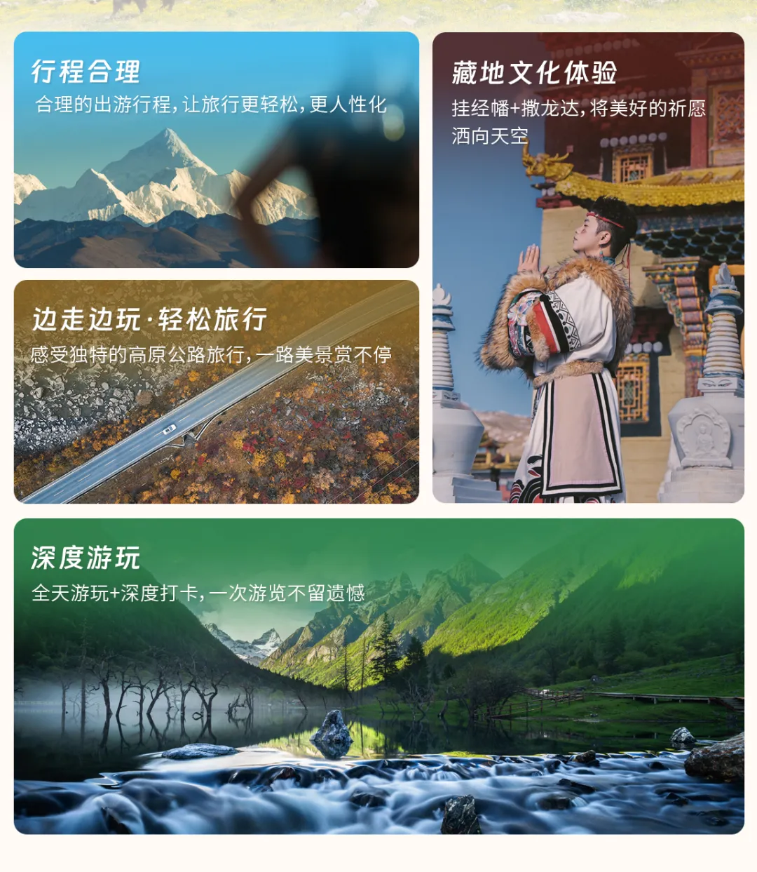 3、全程住宿:6晚標(biāo)準(zhǔn)間(具體以選擇的套餐為準(zhǔn))(含贈(zèng)送一晚成都集合酒店住宿,不用不退亦不做交換;訂單無特別說明默認(rèn)標(biāo)間,沿途大床房較少,以預(yù)定時(shí)間優(yōu)先安排;若單人出行則盡量協(xié)調(diào)拼房,若拼房不成功則補(bǔ)房差費(fèi)用);