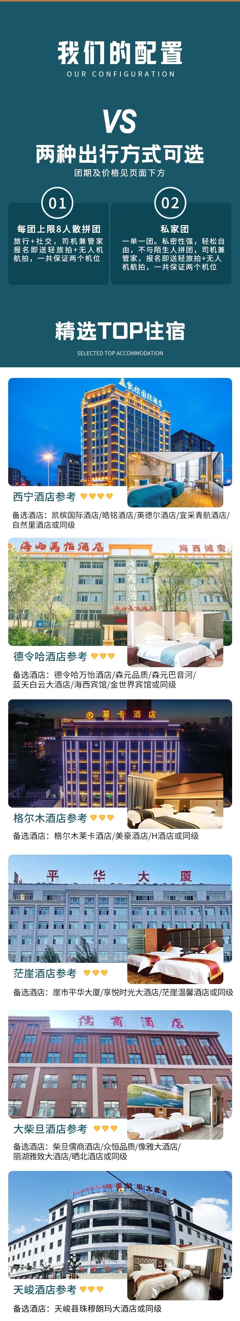 1、住宿:西寧市4鉆酒店標(biāo)間1晚、德令哈市3鉆酒店標(biāo)間1晚、格爾木市3鉆酒店標(biāo)間2晚、茫崖3鉆酒店標(biāo)間1晚、大柴旦鎮(zhèn)3鉆酒店標(biāo)間1晚、天峻縣3鉆酒店標(biāo)間1晚;