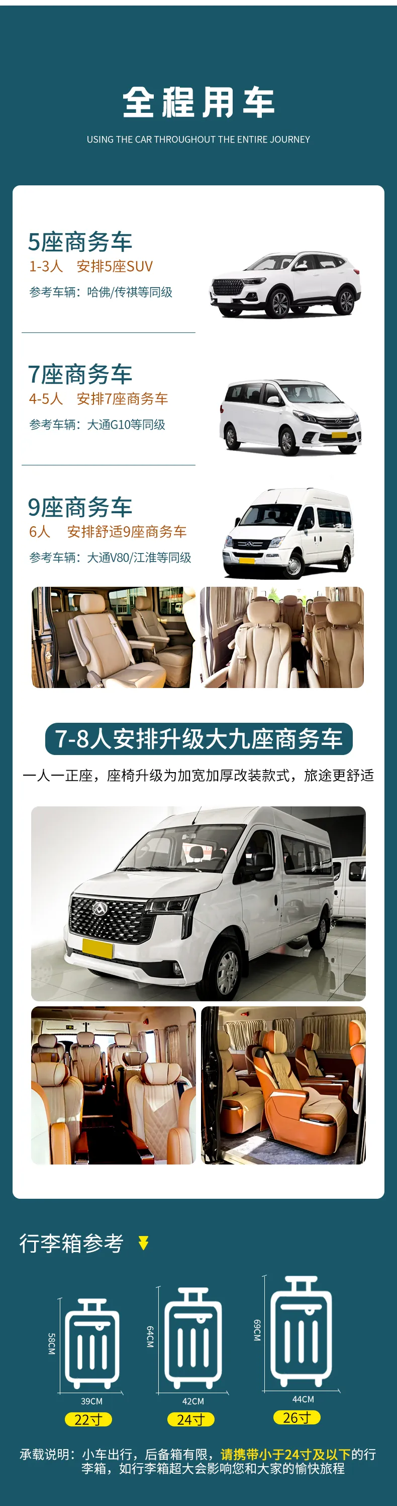 3、用車:2-3人用5座SUV,4-5人用7座商務(wù)車,6人用普通9座商務(wù)車,7-8人用改裝大九座商務(wù)車(小團(tuán)副駕駛及前后座位置需要輪流乘坐,望悉知);