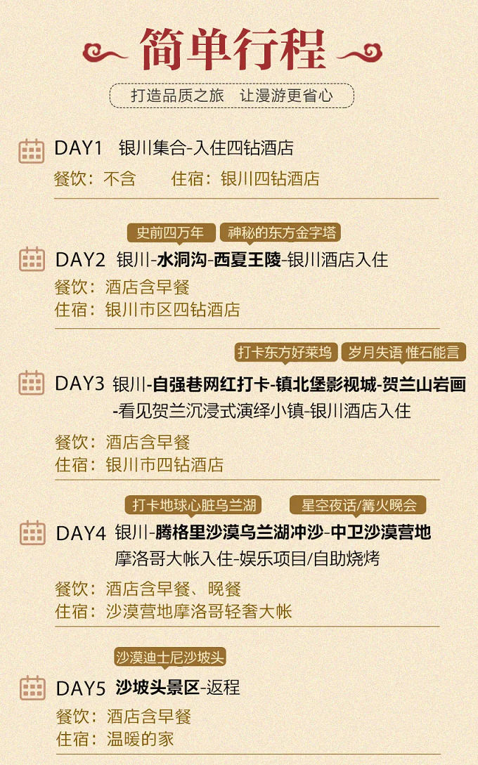 2.住宿 :3晚銀川四鉆酒店標間含雙早;1晚中衛(wèi)沙漠營地輕奢摩洛哥大帳雙人間露營;