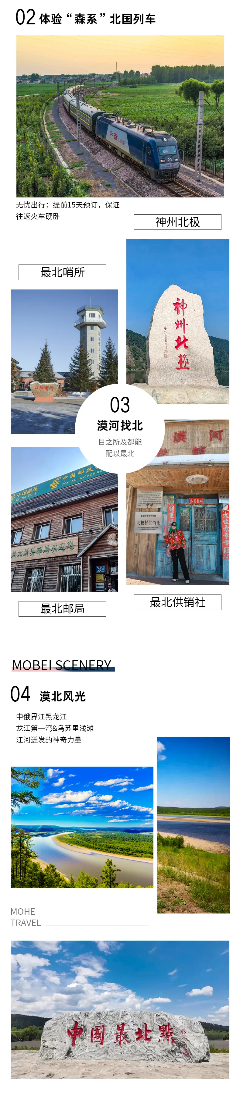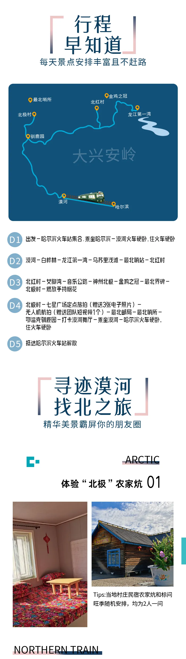 北極村---七星廣場(chǎng)定點(diǎn)旅拍(贈(zèng)送3張電子照片)---無(wú)人機(jī)航拍(贈(zèng)送團(tuán)隊(duì)短視頻1個(gè))---最北郵局---最北哨所---鄂溫克馴鹿園---打卡漠河舞廳---漠河(90KM,車程約1.5小時(shí))-哈爾濱