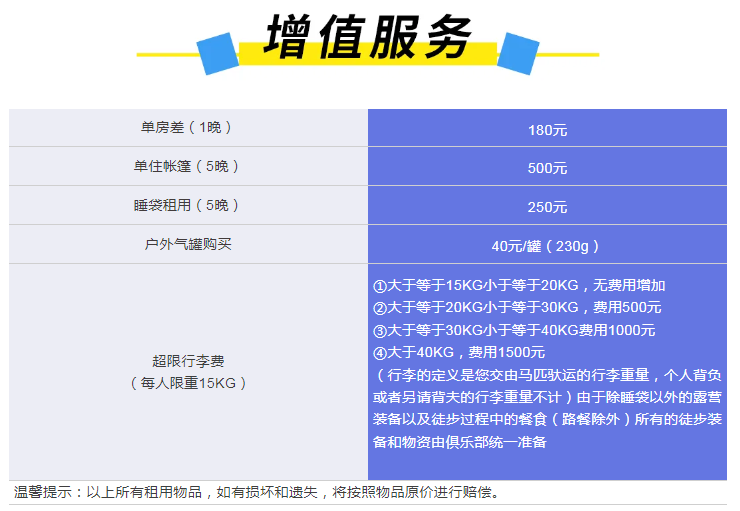 5、個(gè)人裝備超出15kg的部分,做出相應(yīng)的差價(jià)補(bǔ)足;